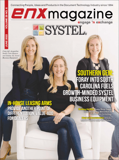 FAYETTEVILLE, NC (June 1, 2022) – ENX Magazine featured Systel Business Equipment as the cover story for its June 2022 issue as part of the Magazine’s Dealer Spotlight series. This is the first time that Legacy owners, Jacqueline Smith, Cara Spencer, and Janene Aul, also known as the “Systel Sisters,” have graced the cover of a top industry publication.